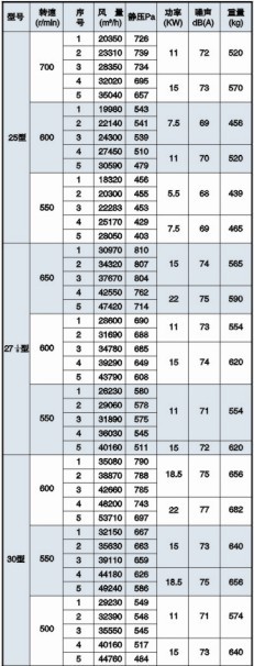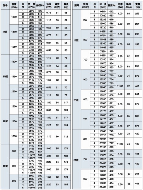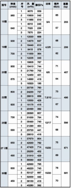 六、HTFC(DT)-Ⅱ型消防通風(fēng)(兩用)低噪聲柜式離心通風(fēng)機(jī)性能參數(shù)表